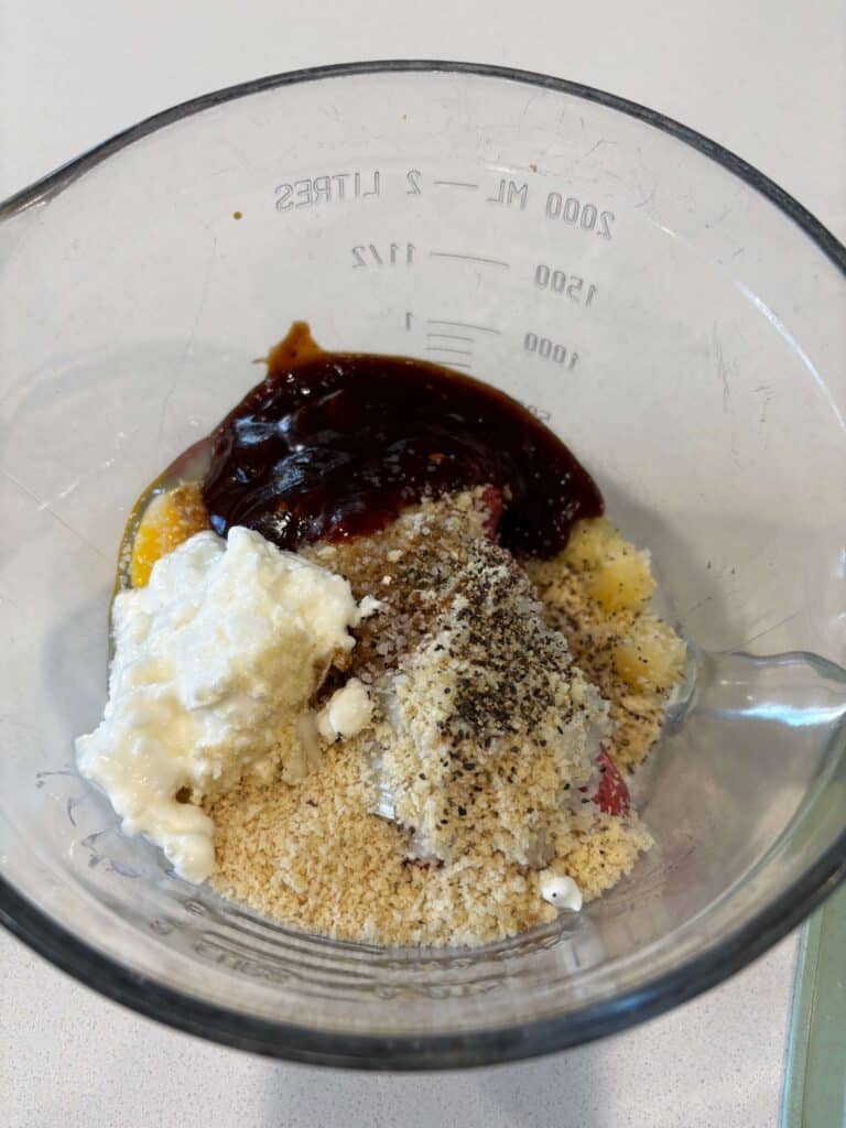 - In a bowl add the beef, onion, bread crumbs, garlic, Worcestershire sauce, egg, cottage cheese, bbq sauce, ¼ tsp salt and pepper. Stir until combined, try not to overmix.