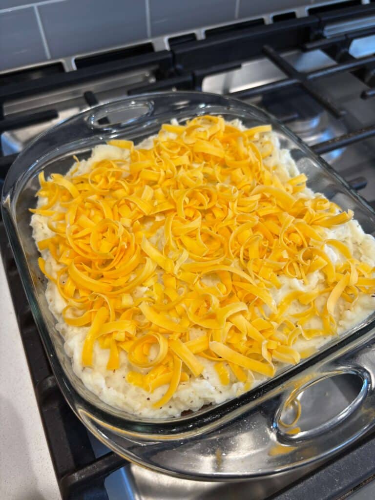 Spread the potatoes on top of the cooked meatloaf. Sprinkle the cheese on top. Bake for 15 more minutes.