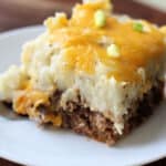 A hearty layer of meatloaf with creamy mashed potatoes and cheddar on top. Everything you love about a classic meatloaf dinner baked into one easy dish.
