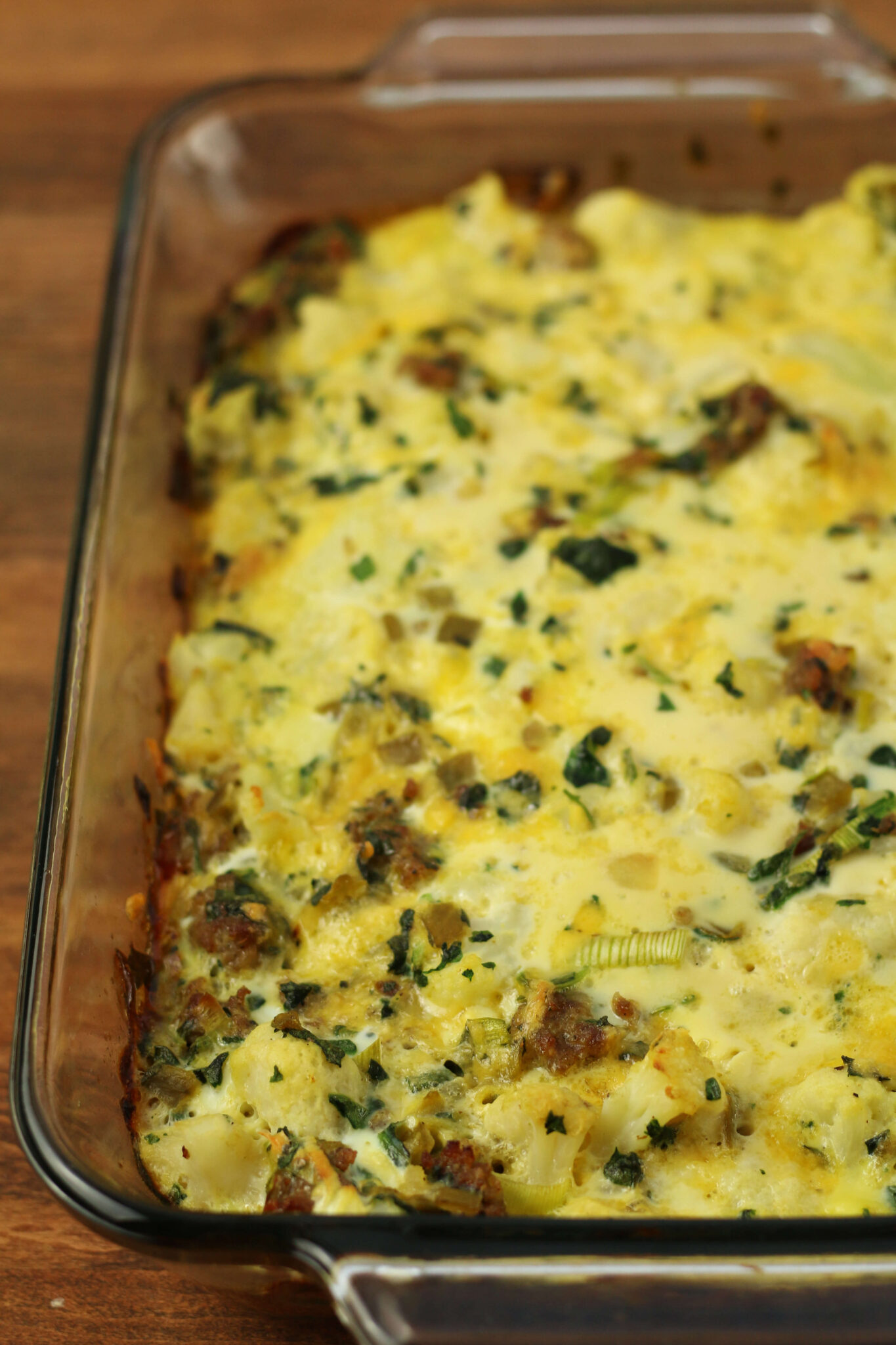 An egg and sausage breakfast casserole with veggies. A healthy and delicious way to start your day.