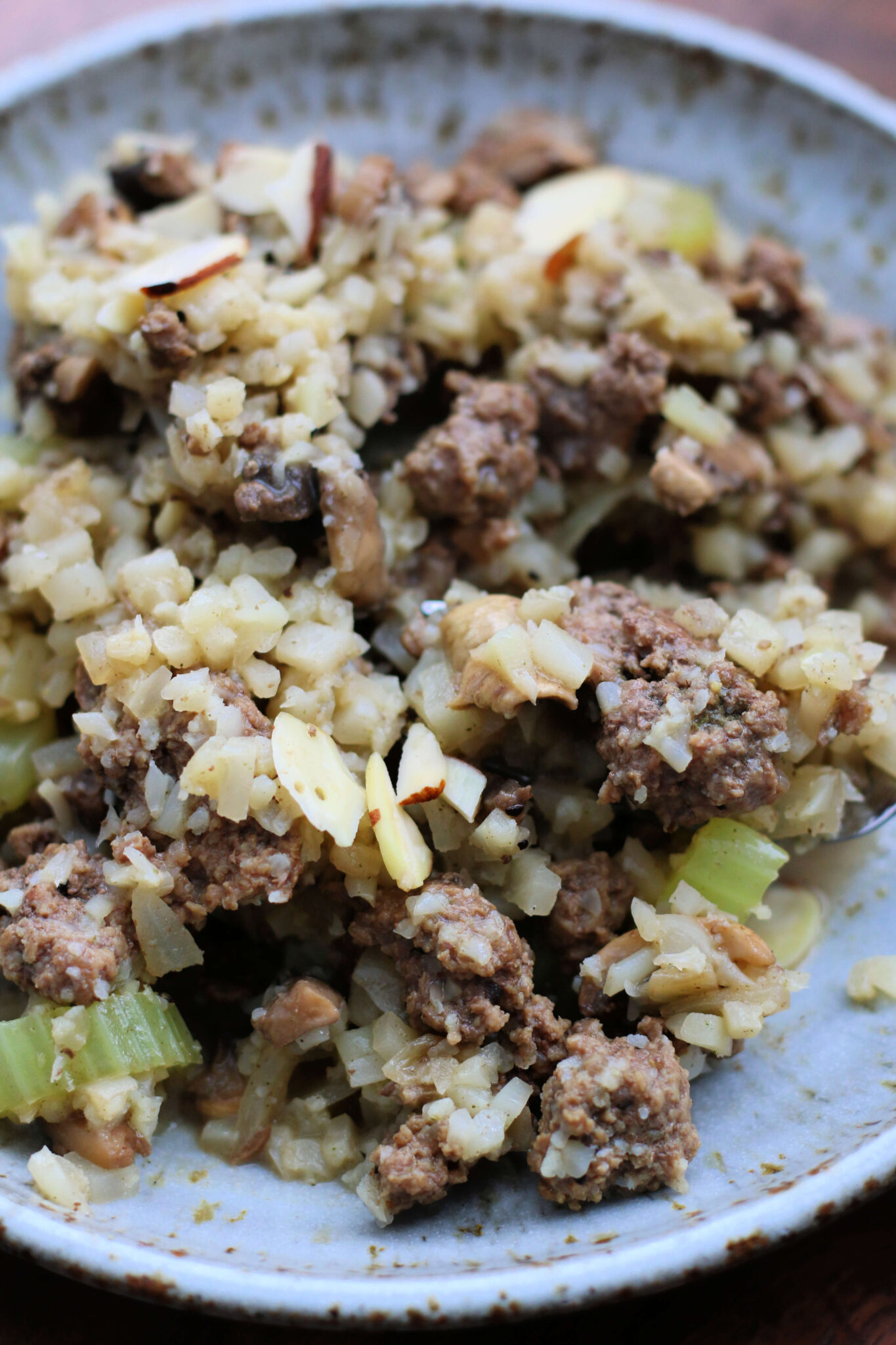An easy one-pan meal combining ground beef, mushrooms, and cauliflower rice in a coconut milk sauce and topped with sliced almonds.