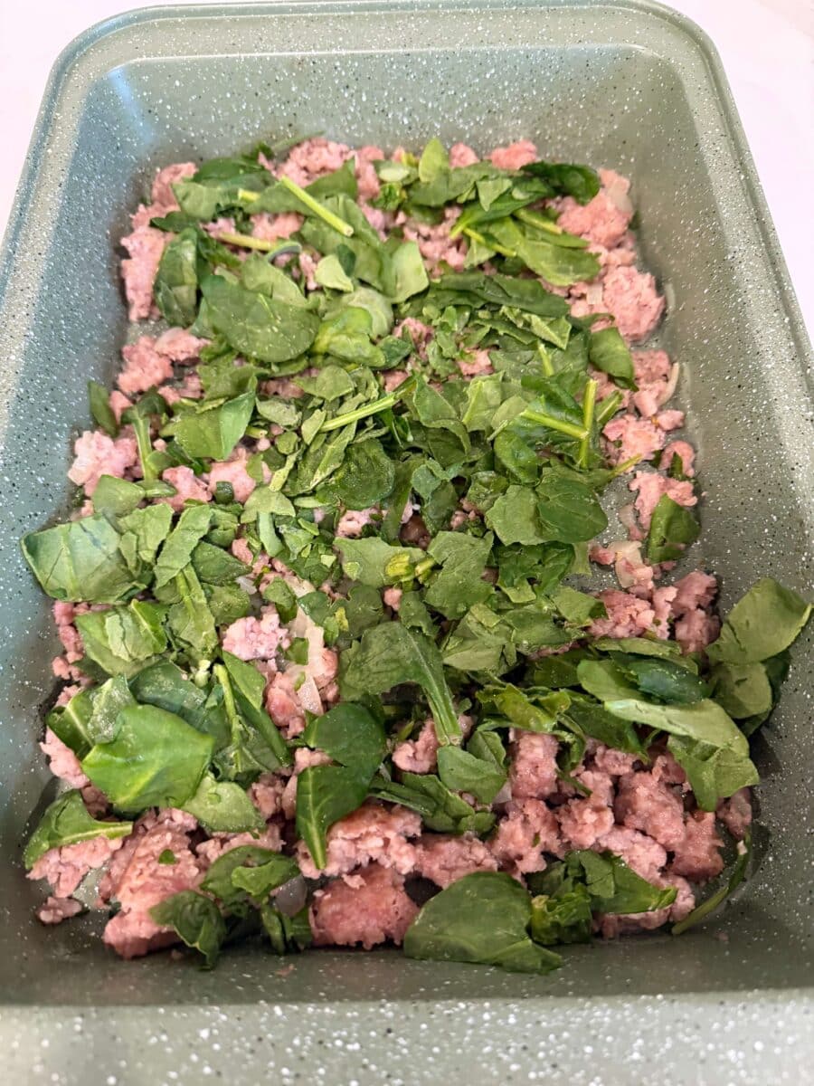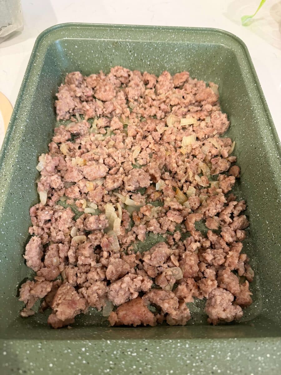 - Spread the sausage into the bottom of the 9×13 inch pan.