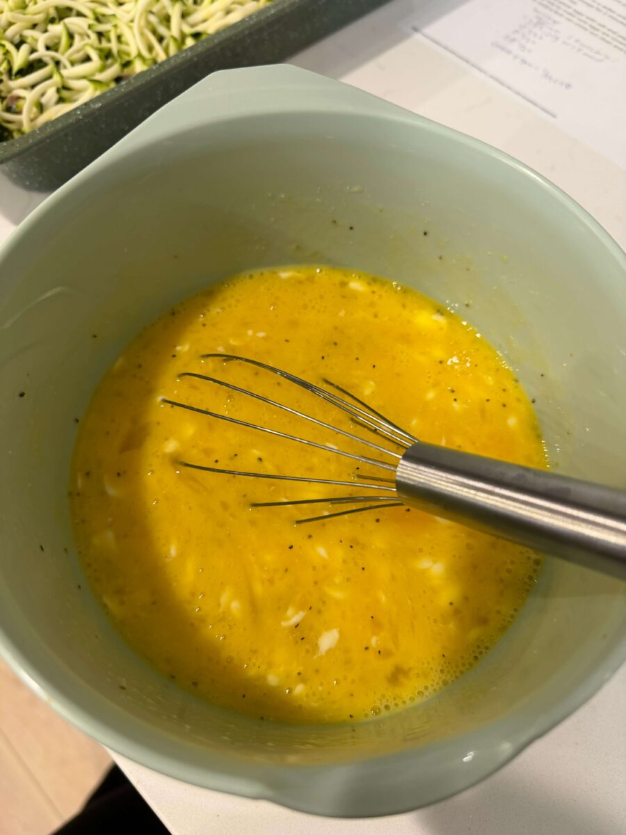 - In a mixing bowl add the eggs, salt, pepper, garlic powder and Greek yogurt. Whisk until smooth. Pour the mixture over the top of the zucchini.