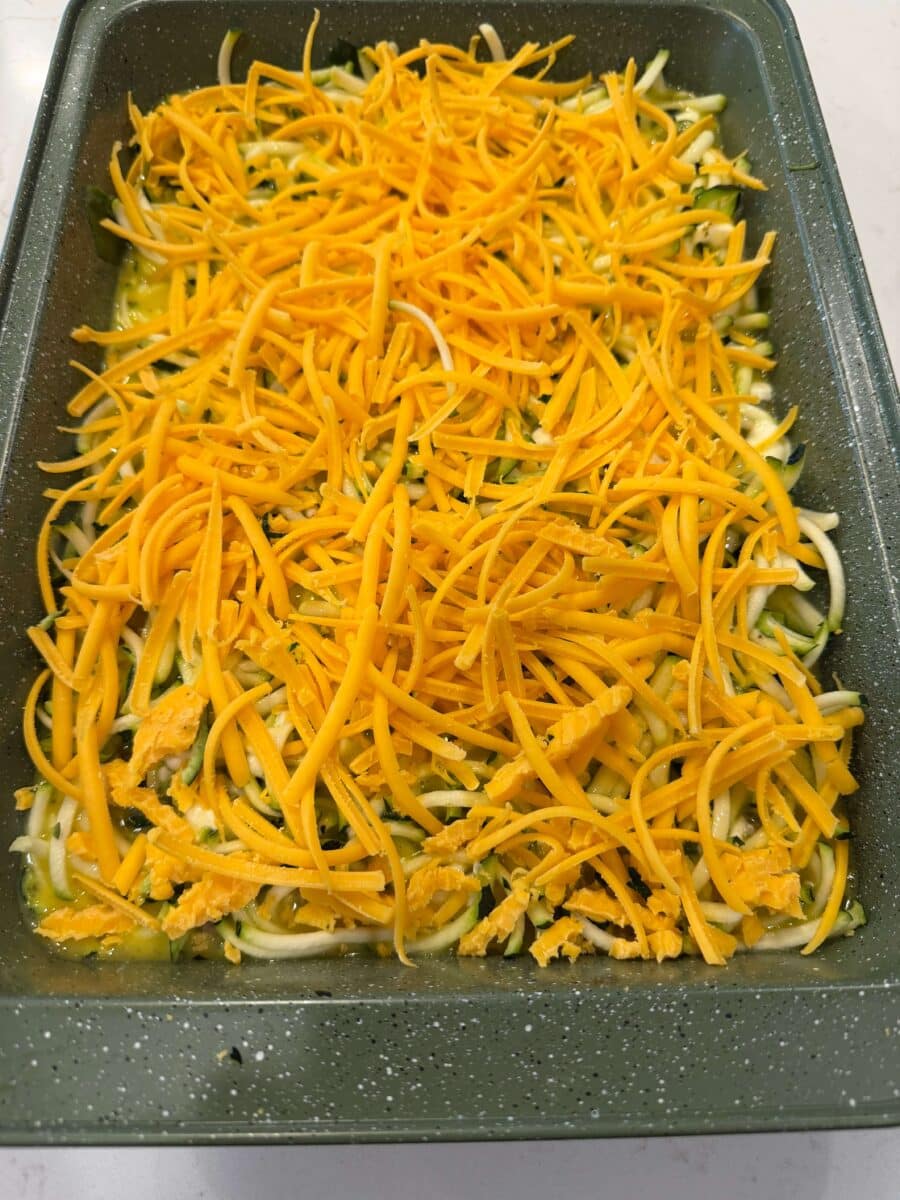In a mixing bowl add the eggs, salt, pepper, garlic powder and Greek yogurt. Whisk until smooth. Pour the mixture over the top of the zucchini.