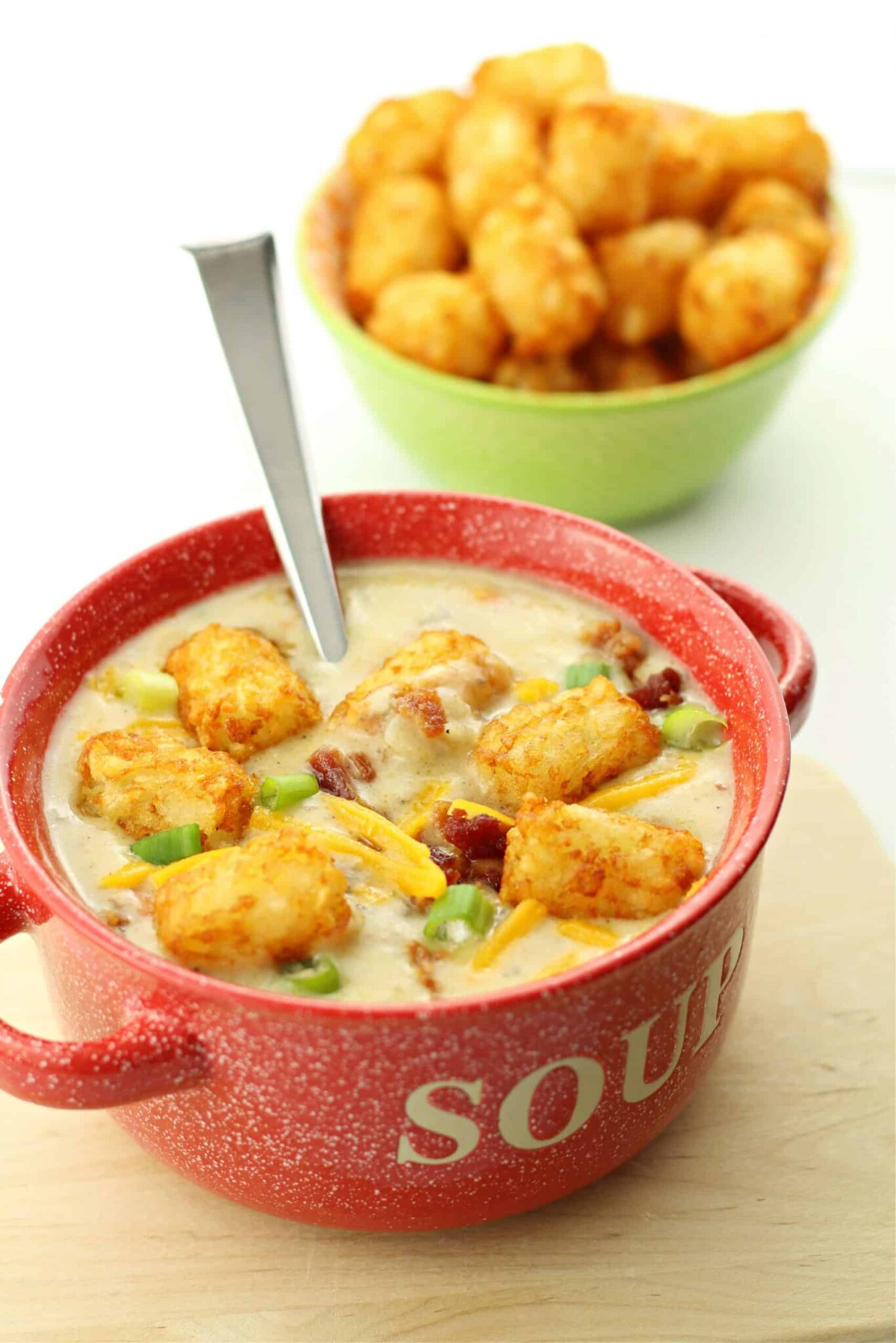A cheesy hashbrown ground beef soup that is topped with tater tots in the place of croutons.