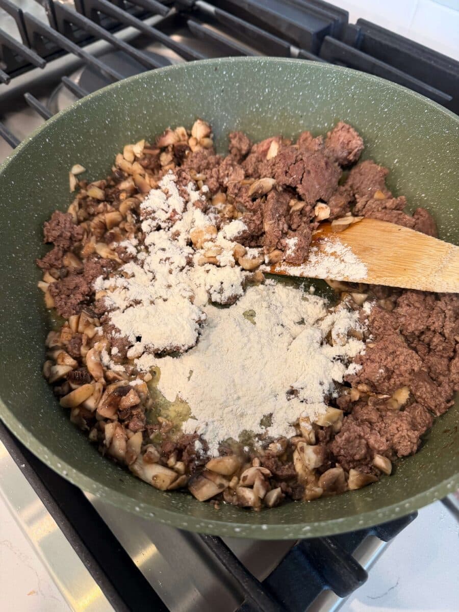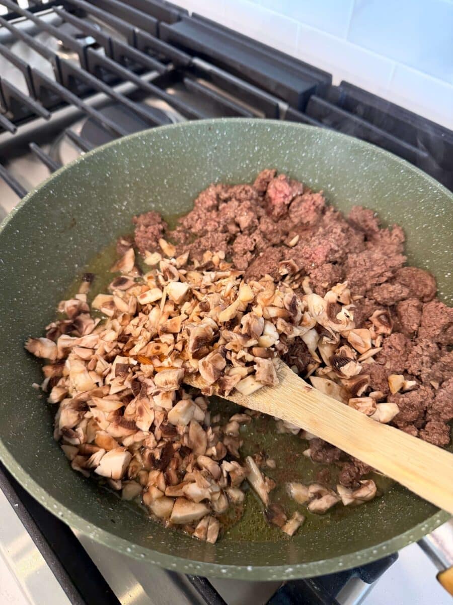 - Heat a large pan over medium high heat. Add in the beef and break it up. Brown for 5 minutes. Add in the mushrooms, onion, salt, pepper and garlic powder and stir until mushrooms start shrinking down.