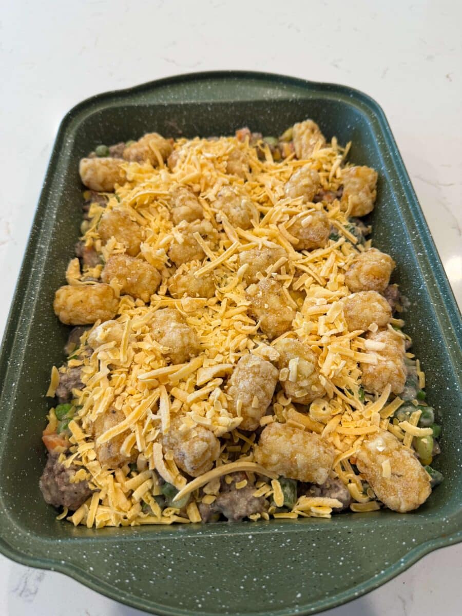 - Spread in a 9×13 inch baking dish. Layer the tater tots on top. Sprinkle with the cheese.