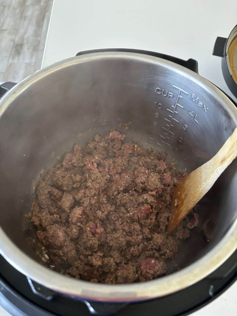 - Turn Instant Pot to saute setting. When display says HOT add in the beef and break it up. Add in the onion, salt, pepper, garlic powder and paprika. Brown for 5 minutes.