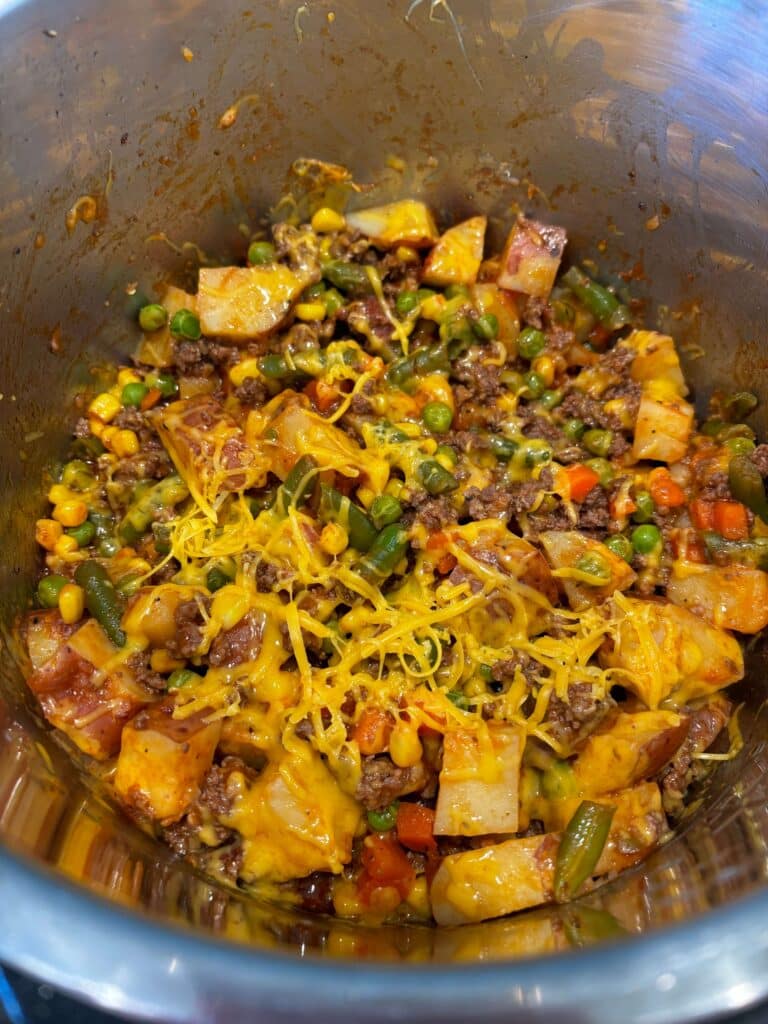 Midwest Casserole–seasoned beef, potatoes and vegetables all in one dish! Make it in your Instant Pot or slow cooker.