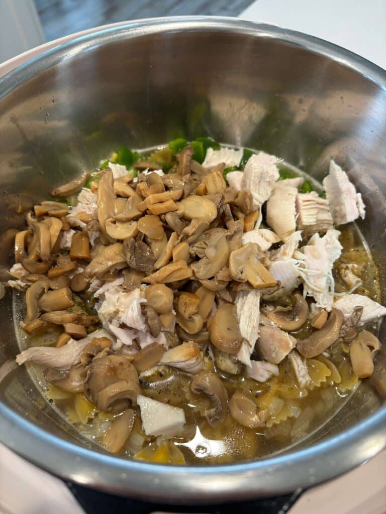 Add in the garlic powder, pepper, salt poultry seasoning, farfalle, green bell pepper, turkey and mushrooms.