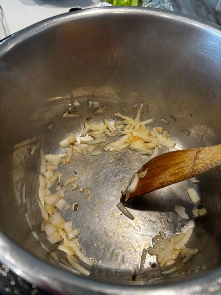 Turn Instant Pot to sauté setting. When display says HOT add in the butter and let it melt. Add in the onion and sauté for 3-4 minutes.