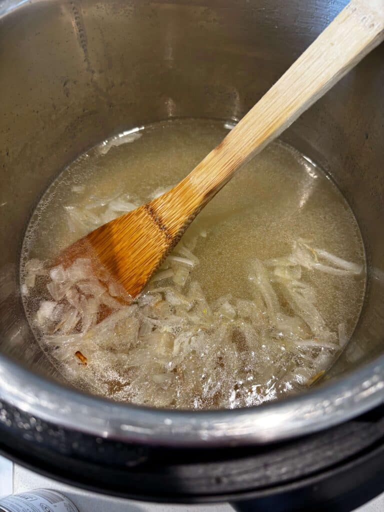 - Pour in the broth and scrape bottom of pot so that nothing is sticking. Turn off Instant Pot.