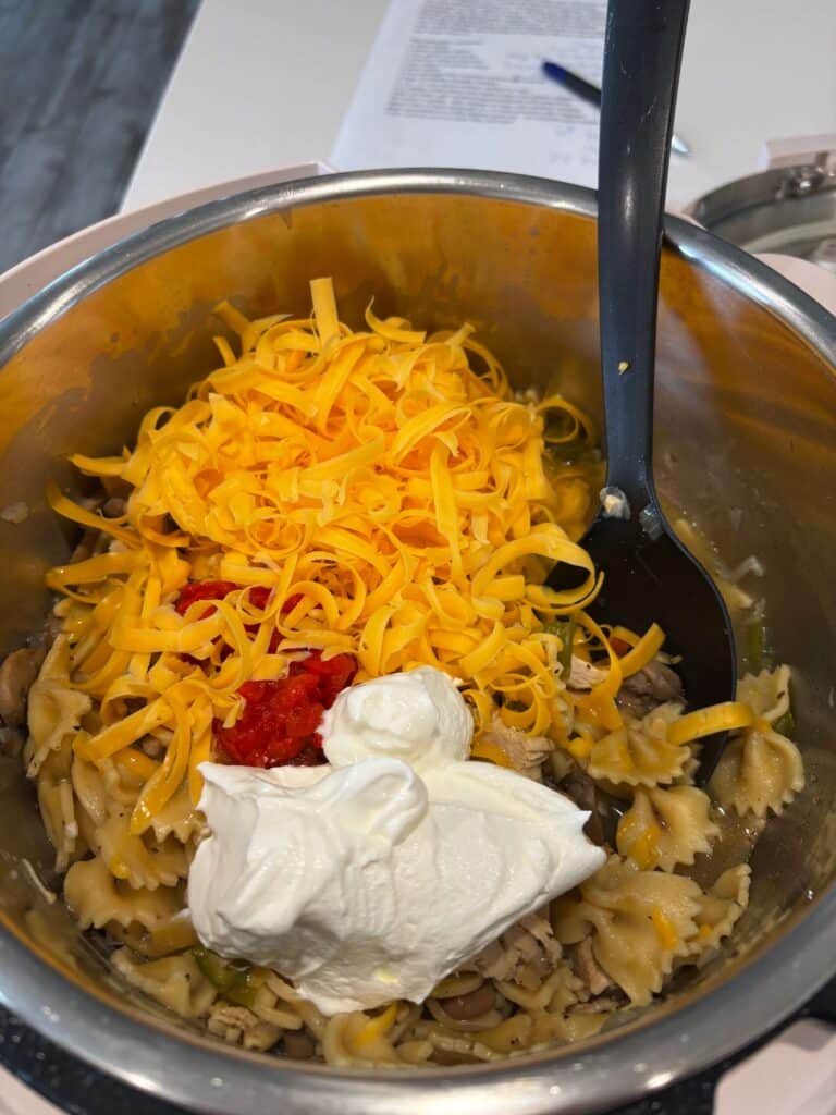 An easy and delicious recipe to use up leftover turkey! Bowtie pasta and turkey are enveloped in a creamy sauce. Make it in minutes in your Instant Pot.