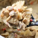 Miss Georgie’s Casserole–an easy and delicious recipe to use up leftover turkey! Bowtie pasta and turkey are enveloped in a creamy sauce. Make it in minutes in your Instant Pot.