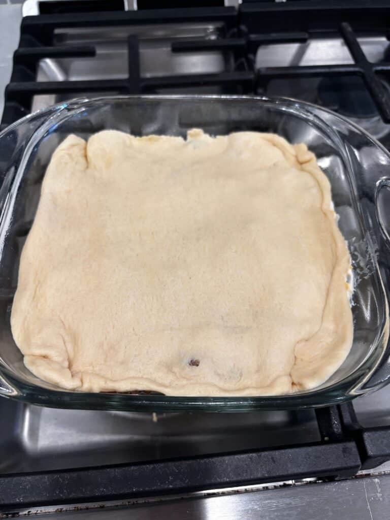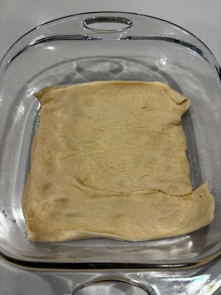 - Unroll the crescent dough sheet and cut it in half. Press one half of the dough into the bottom of the pan. Bake for 10 minutes. Set aside.
