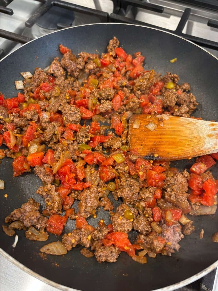 - Heat a pan on the stove. Add in the beef and break it up. Add in the onions and taco seasoning. Brown for 5 minutes. Stir in the drained tomatoes and heat through.