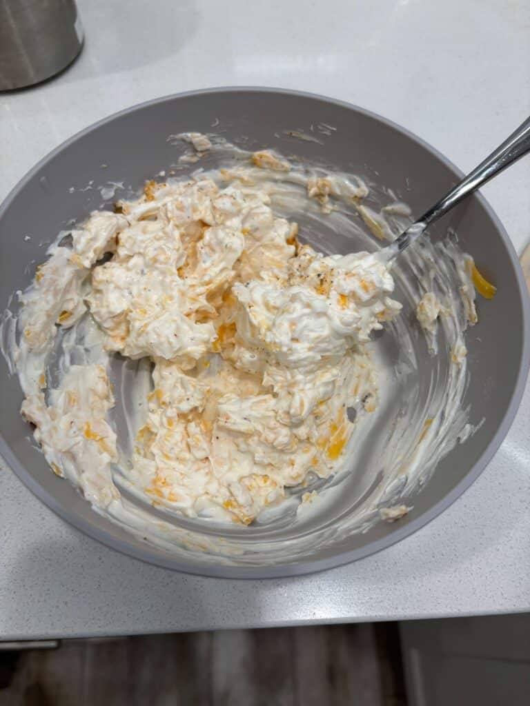 - In a small bowl whisk together the sour cream, mayo, 2 oz of the cheese and the cajun seasoning. Set aside.