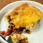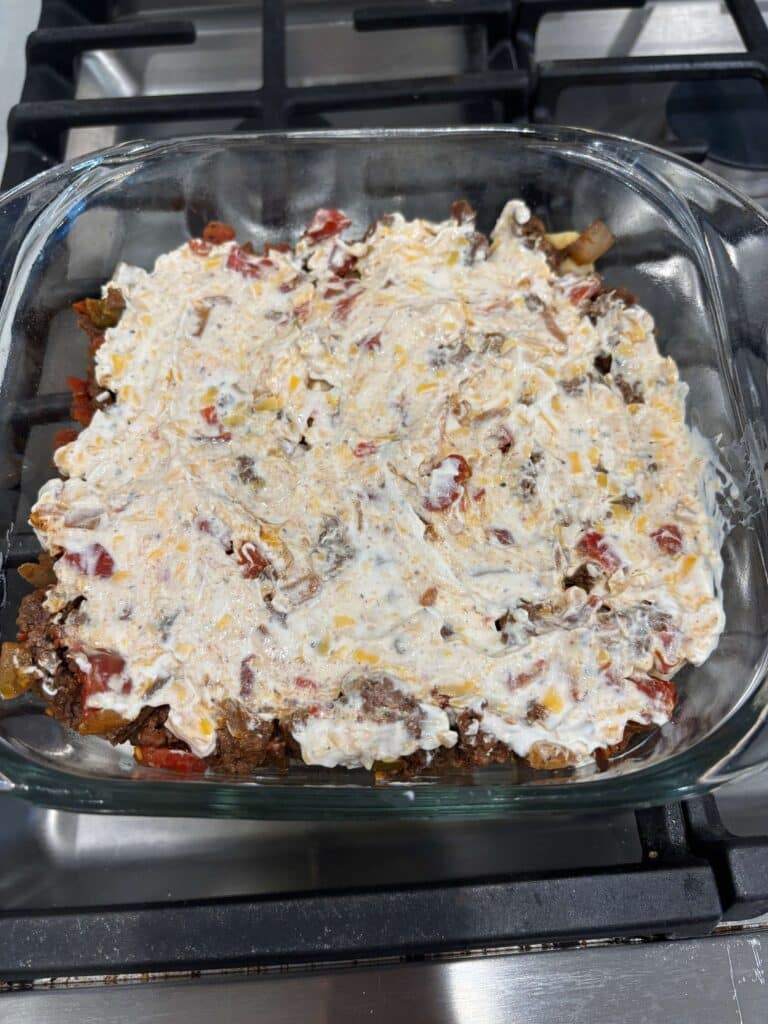 A Tex-Mex style casserole with taco seasoned ground beef, a biscuit crust, Rotel tomatoes and a sour cream and cheese sauce. A hearty cowboy supper.
