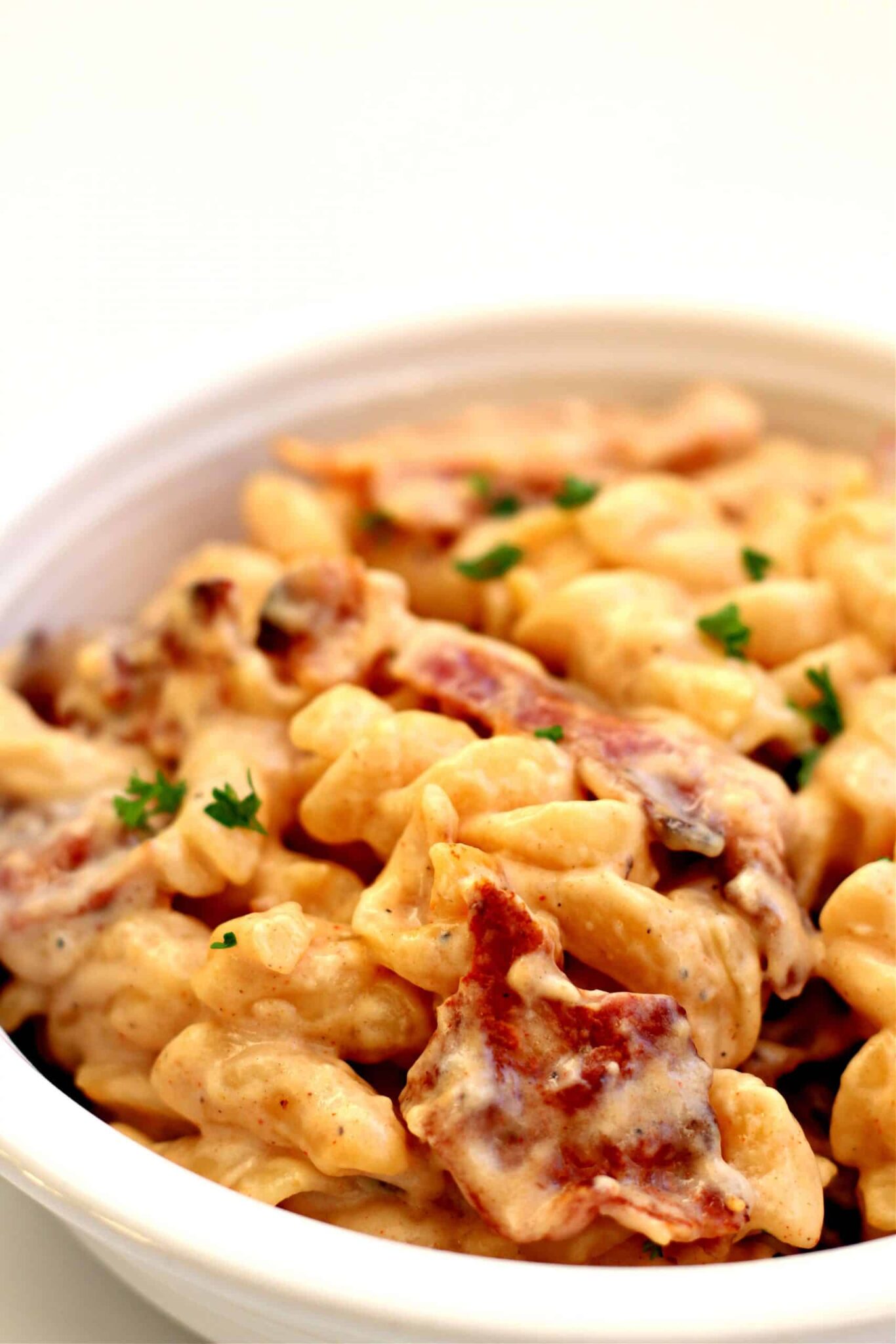 Cheesy, smoky macaroni and cheese with big, crispy pieces of bacon.