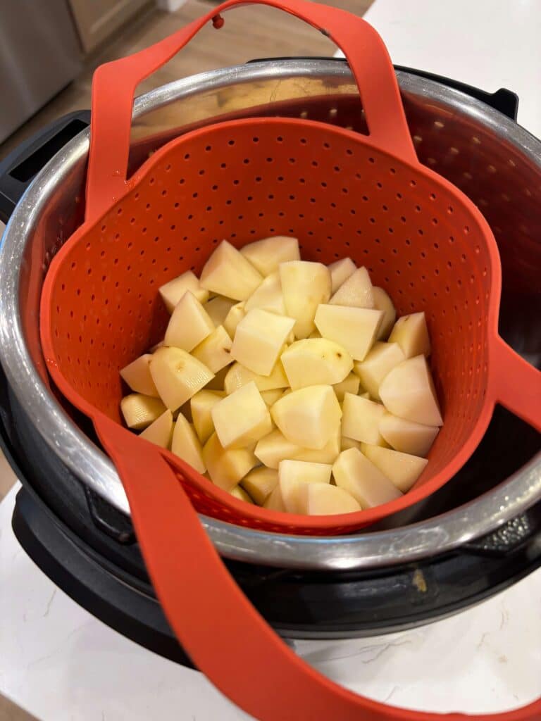 - Meanwhile, prepare the mashed potatoes. Pour 1 ½ cups of water into the bottom of the Instant Pot. Add the potatoes into a steamer basket. Drop the basket into the Instant Pot. Cover and make sure the valve is set to sealing. Set the manual/pressure cook button to 8 minutes. When time is up move the valve to venting. Remove the lid. Place the potatoes into a mixing bowl. Mash. Stir in the butter until melted. Stir in the milk and then salt and pepper to taste. Set aside.