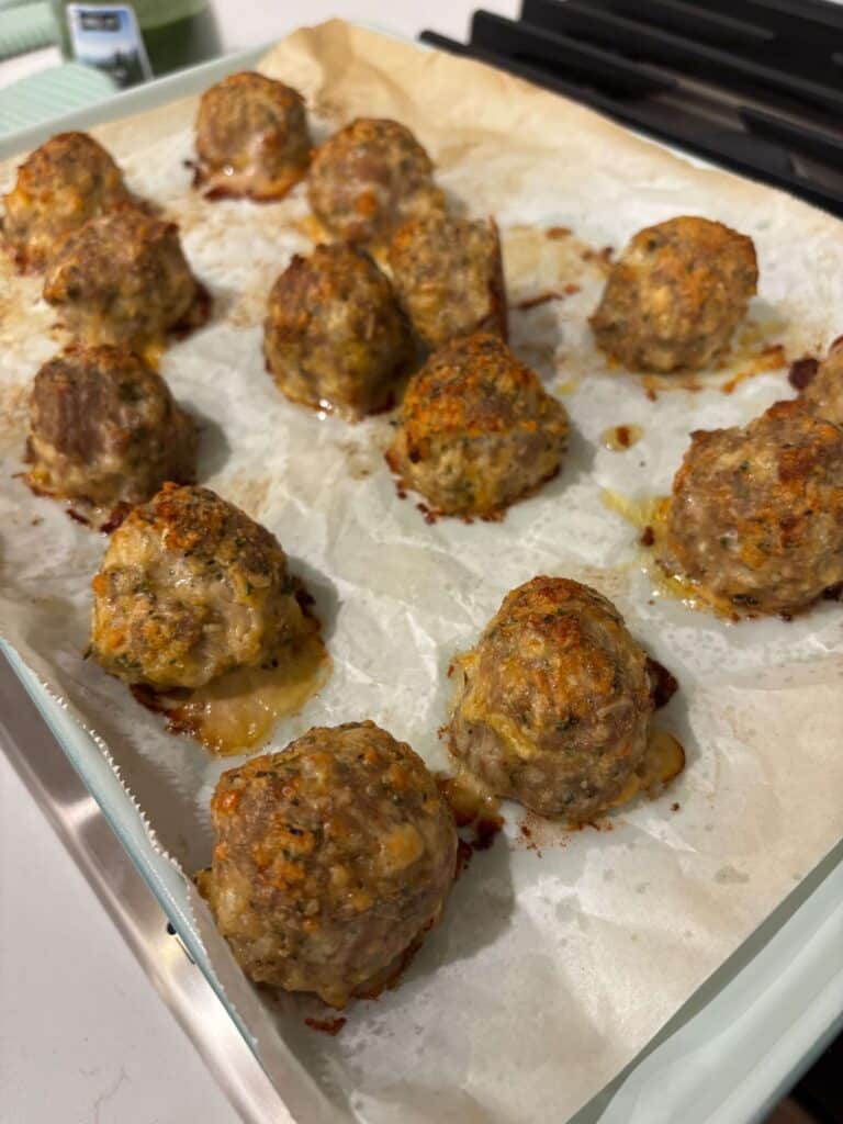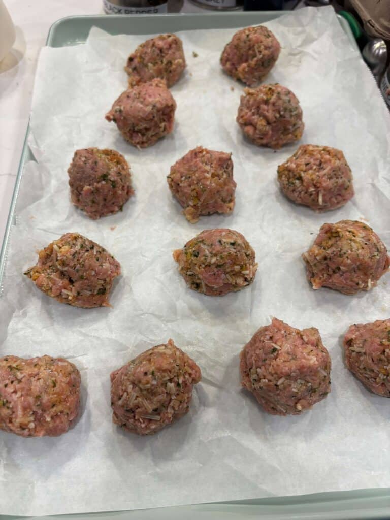 - Heat oven to 400°F. In a mixing bowl add the chicken, egg, panko, shredded parmesan, garlic powder, parsley, onion powder, paprika, salt and pepper. Mix gently until just combined. Shape into golf ball–size balls and place them on a parchment-lined baking sheet. Bake for 20 minutes on the top rack.
