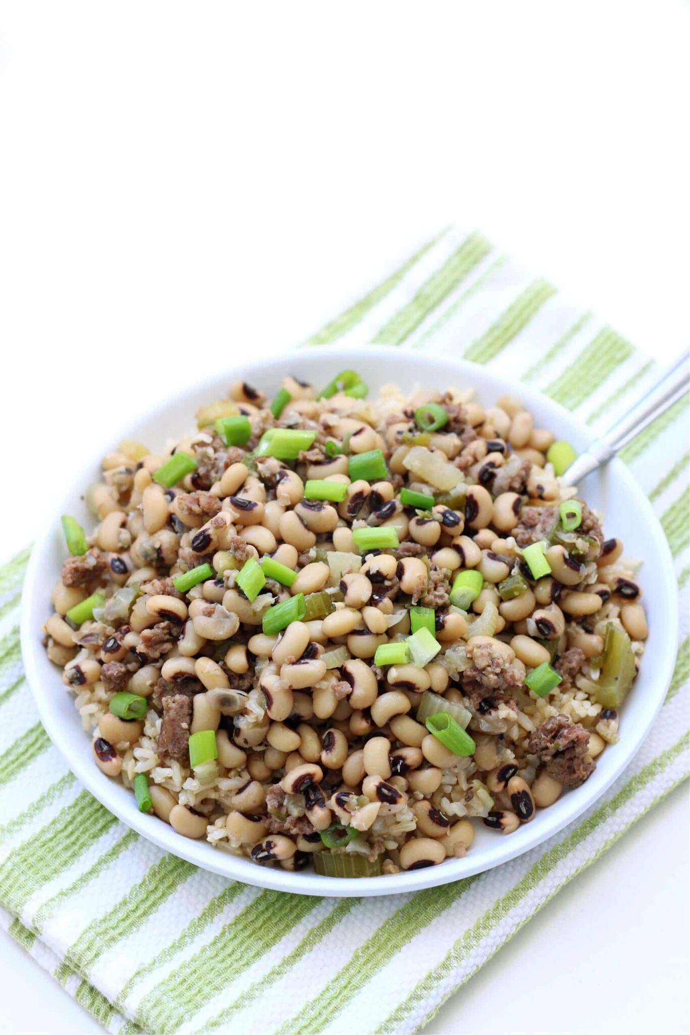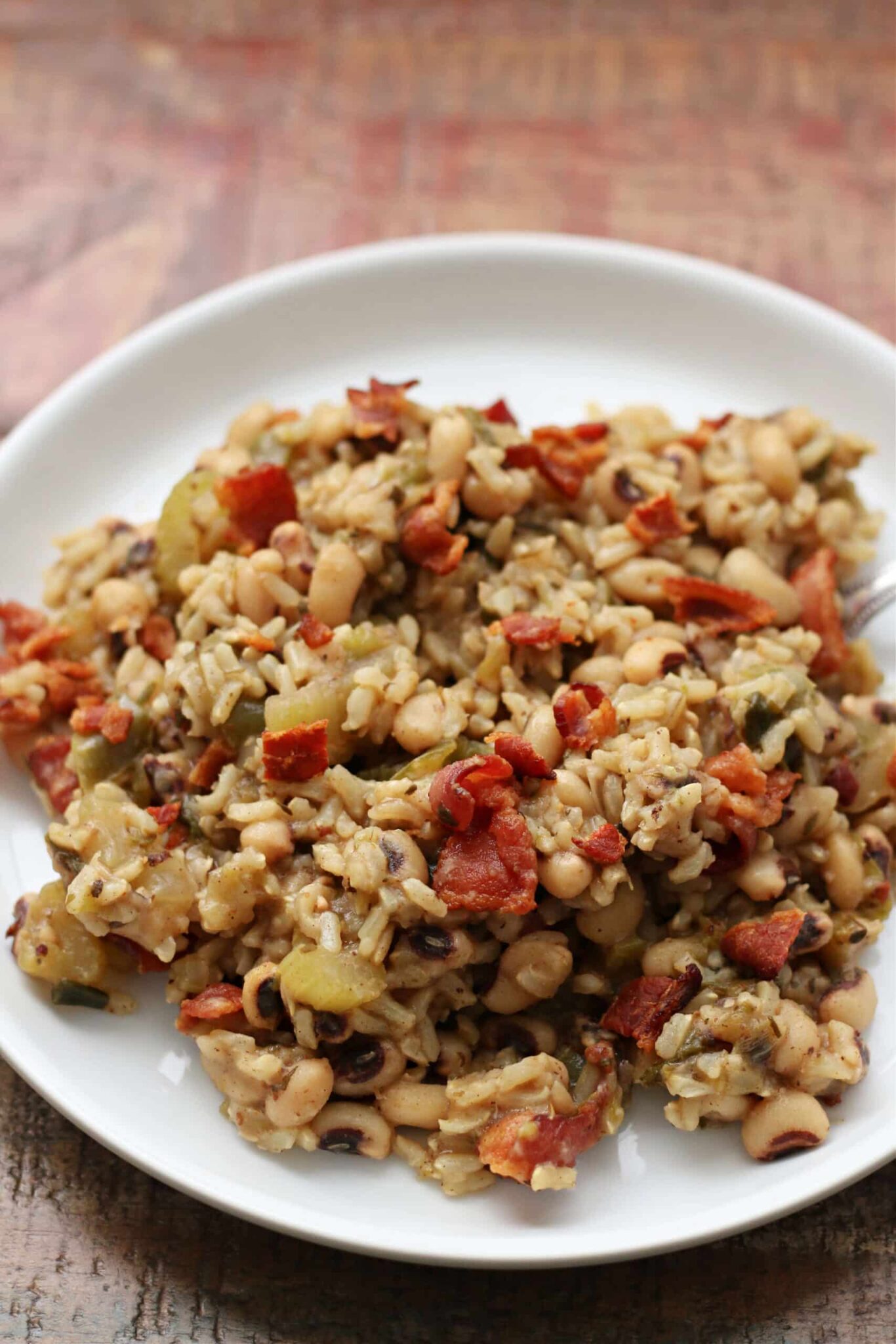 Dried black eyed peas and brown rice are cooked together in your Instant Pot with celery, green onions, green bell peppers and seasonings. Crispy crumbled bacon is stirred into the cooked peas and rice. A healthy and delicious meal to eat for good luck in the new year!