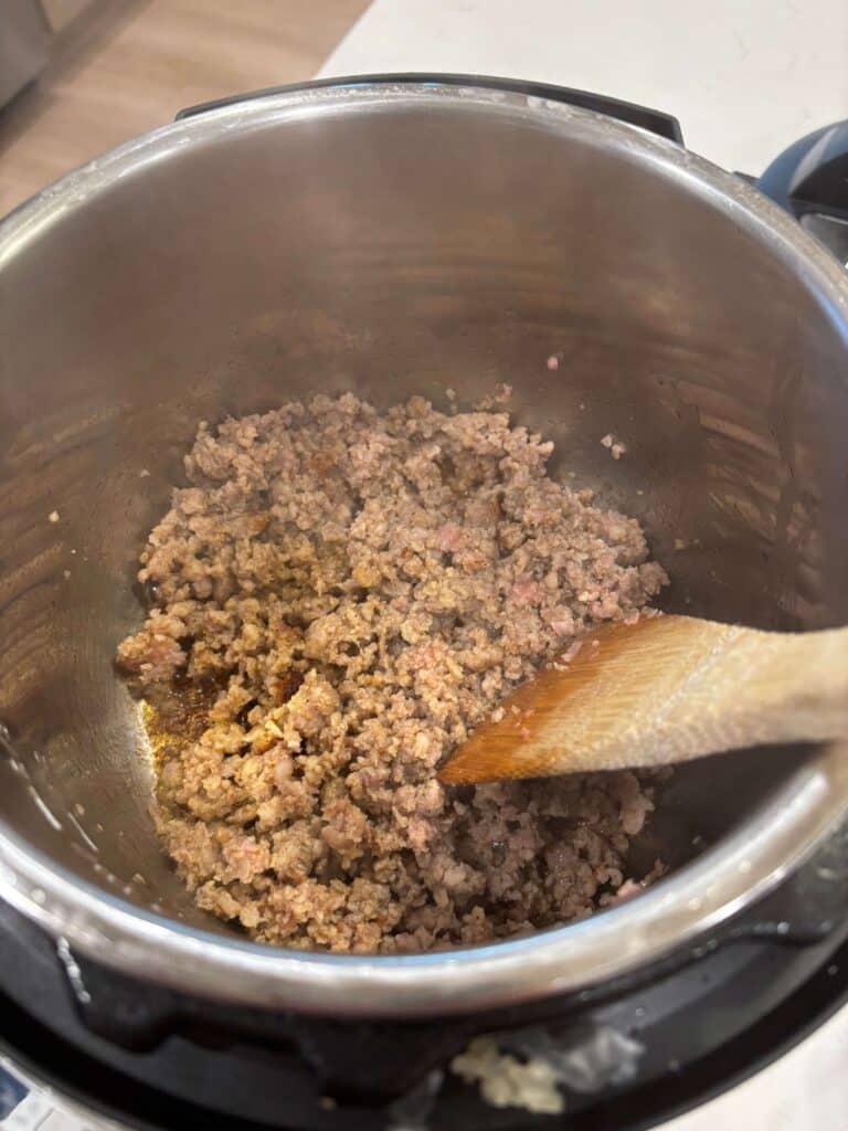 - Turn Instant Pot to sauté setting. When display says HOT add in the sausage and break it up. Brown for 5 minutes. Drain off excess grease.