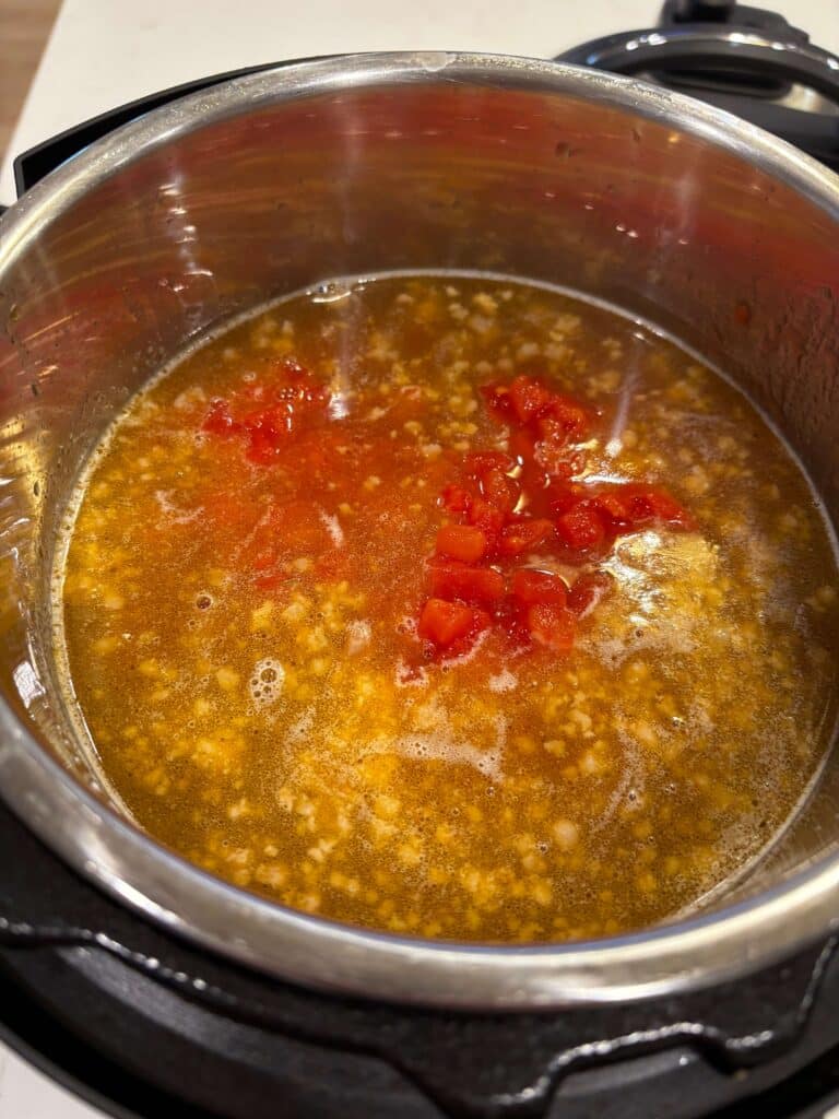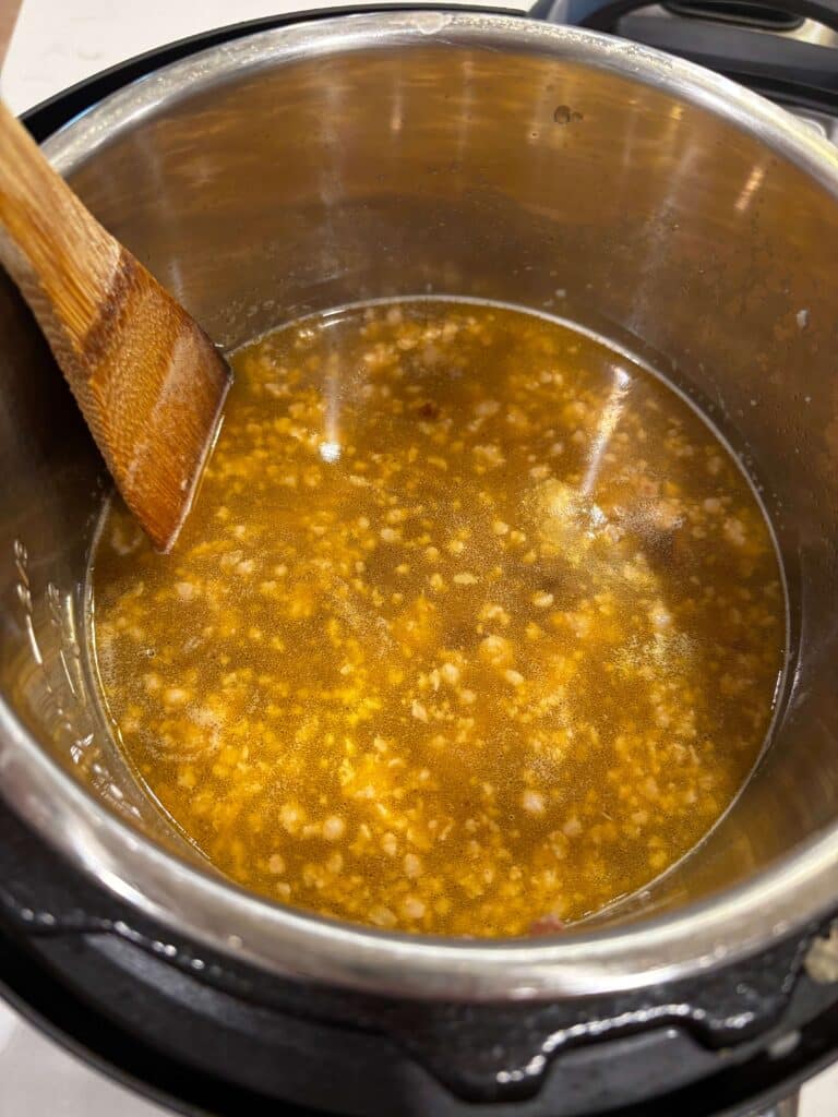 Pour in the broth and scrape bottom of pot so that nothing is sticking. Turn off Instant Pot.