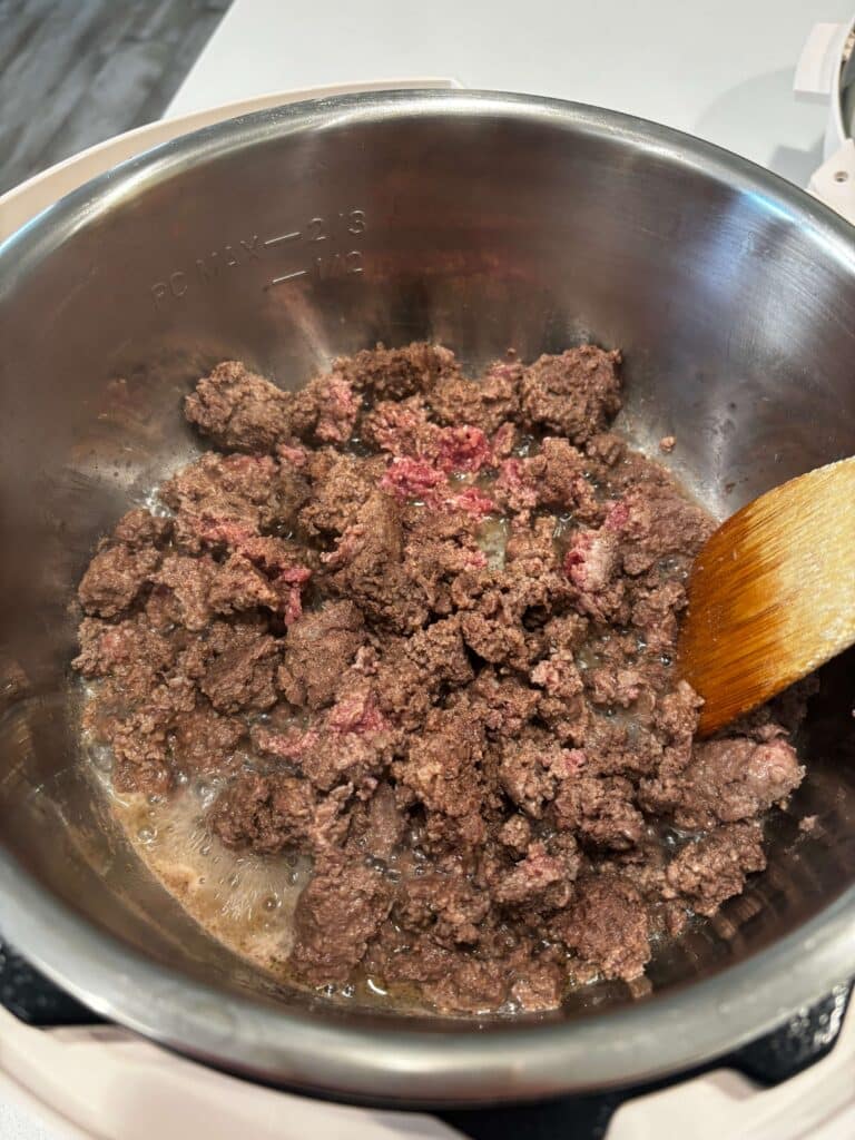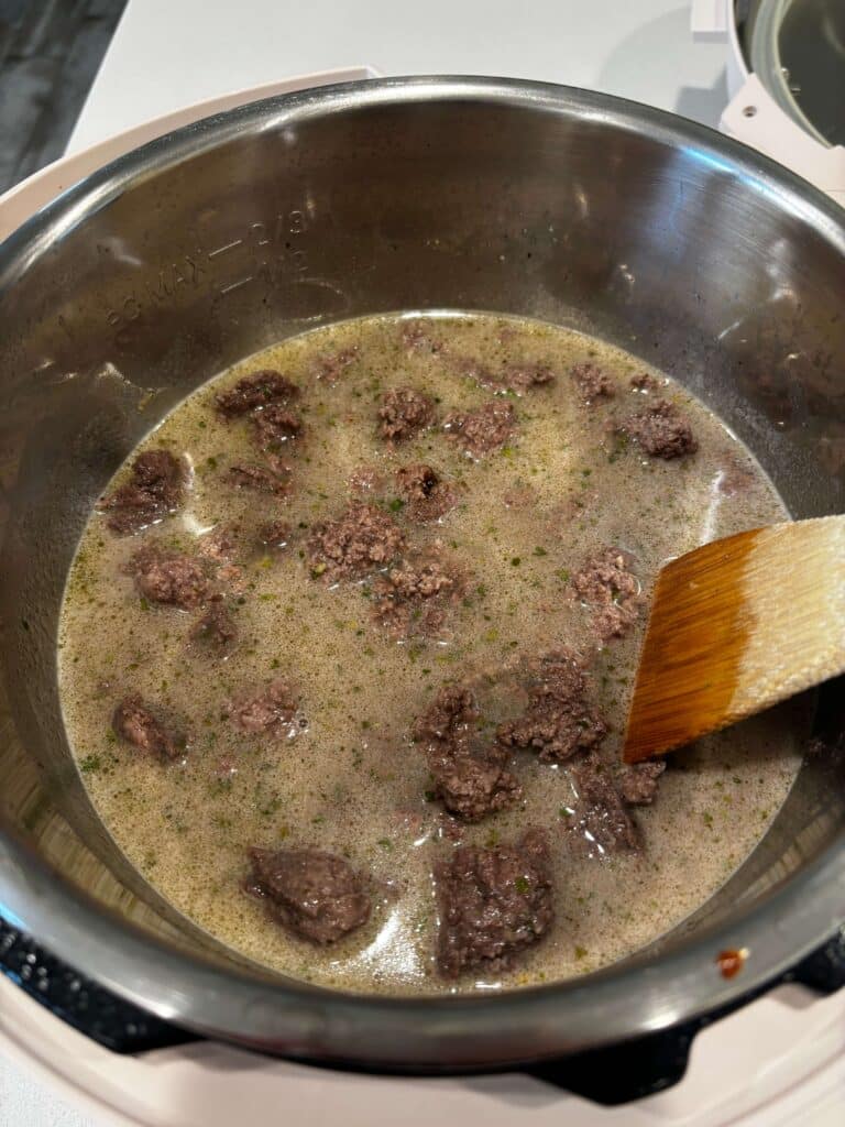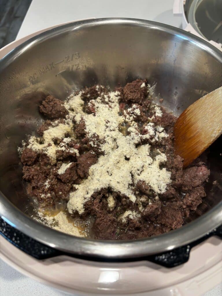 - Turn Instant Pot to sauté setting. When display says HOT add in the beef and break it up. Brown for 5 minutes. Drain off excess grease. Stir in the ranch dressing mix.