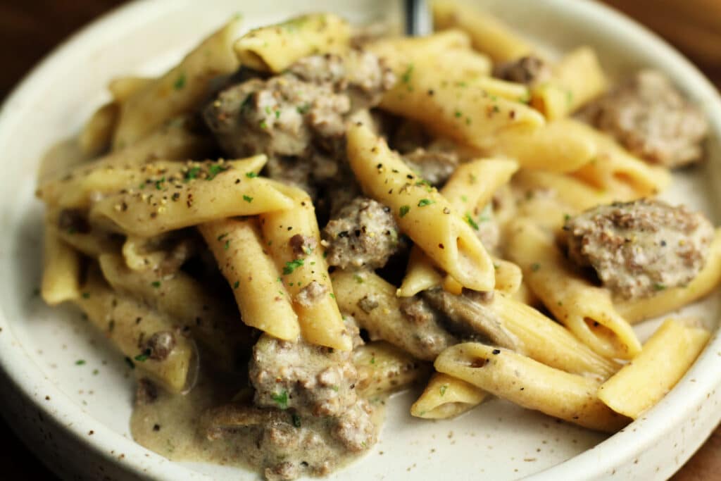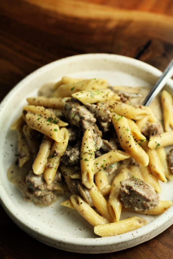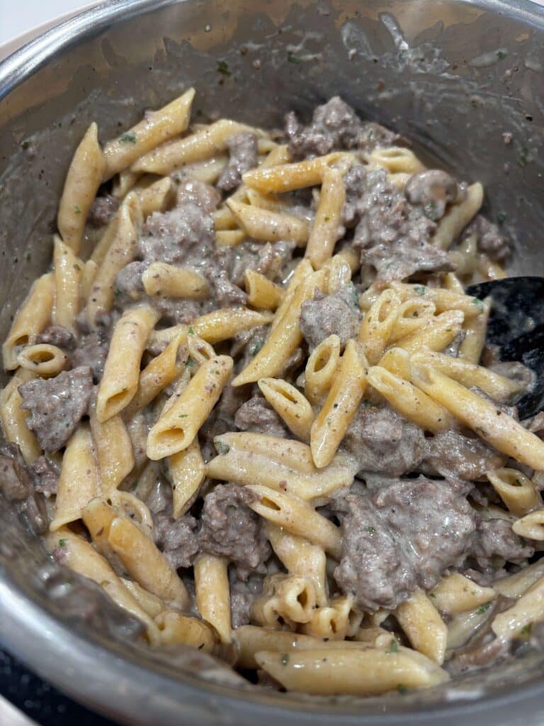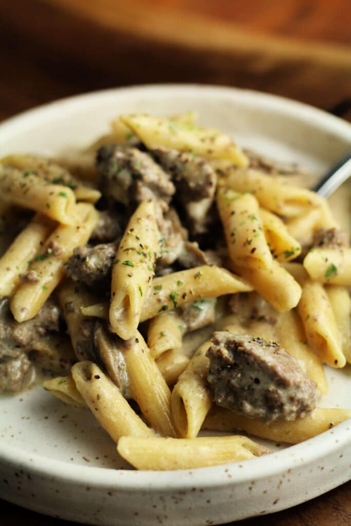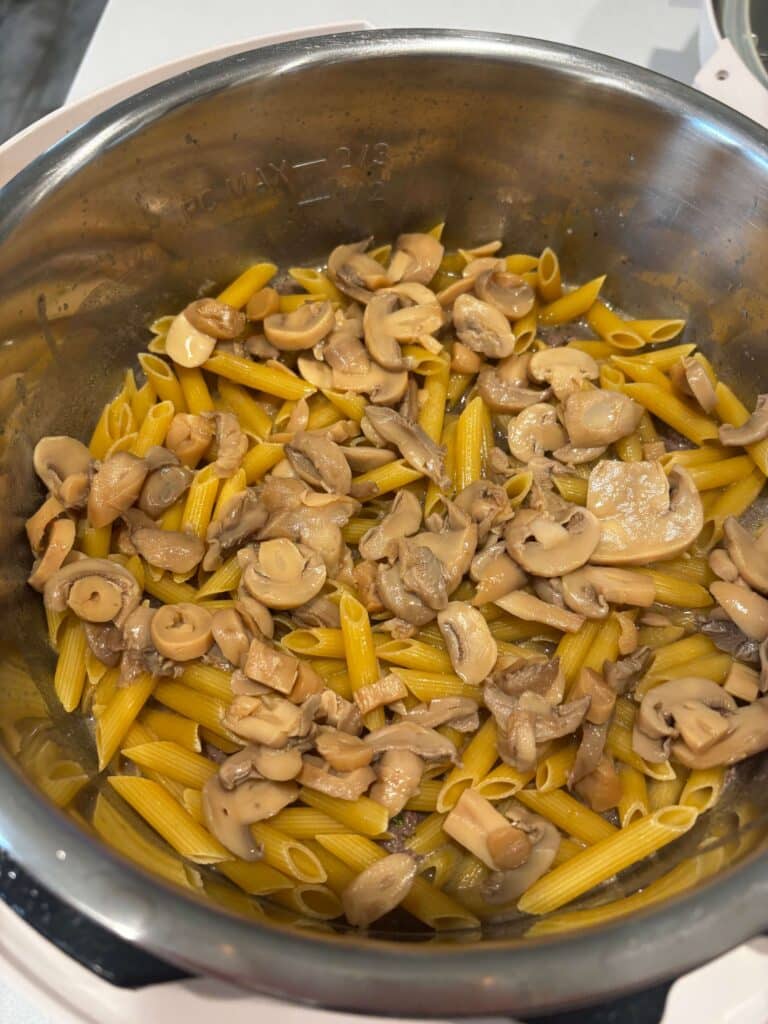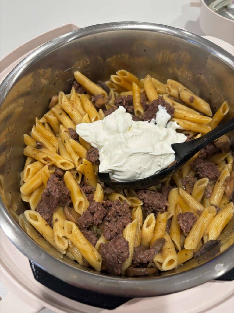 An easy Instant Pot recipe with seasoned ground beef, tender penne, sliced mushrooms and a creamy sour cream sauce.