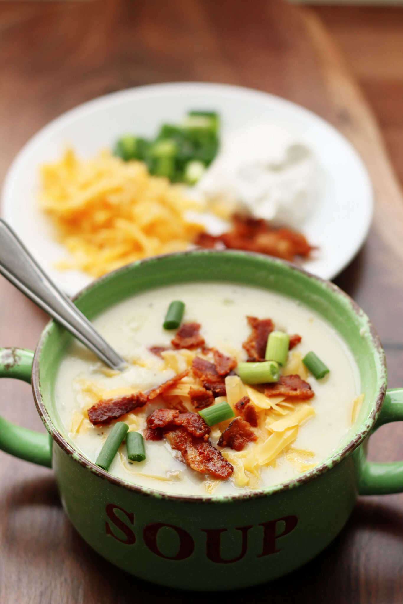 Baked potato soup made in your Instant Pot with all the toppings served on the side so you can have complete control over your own bowl of soup.