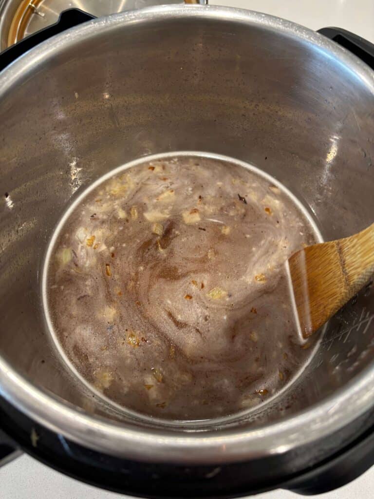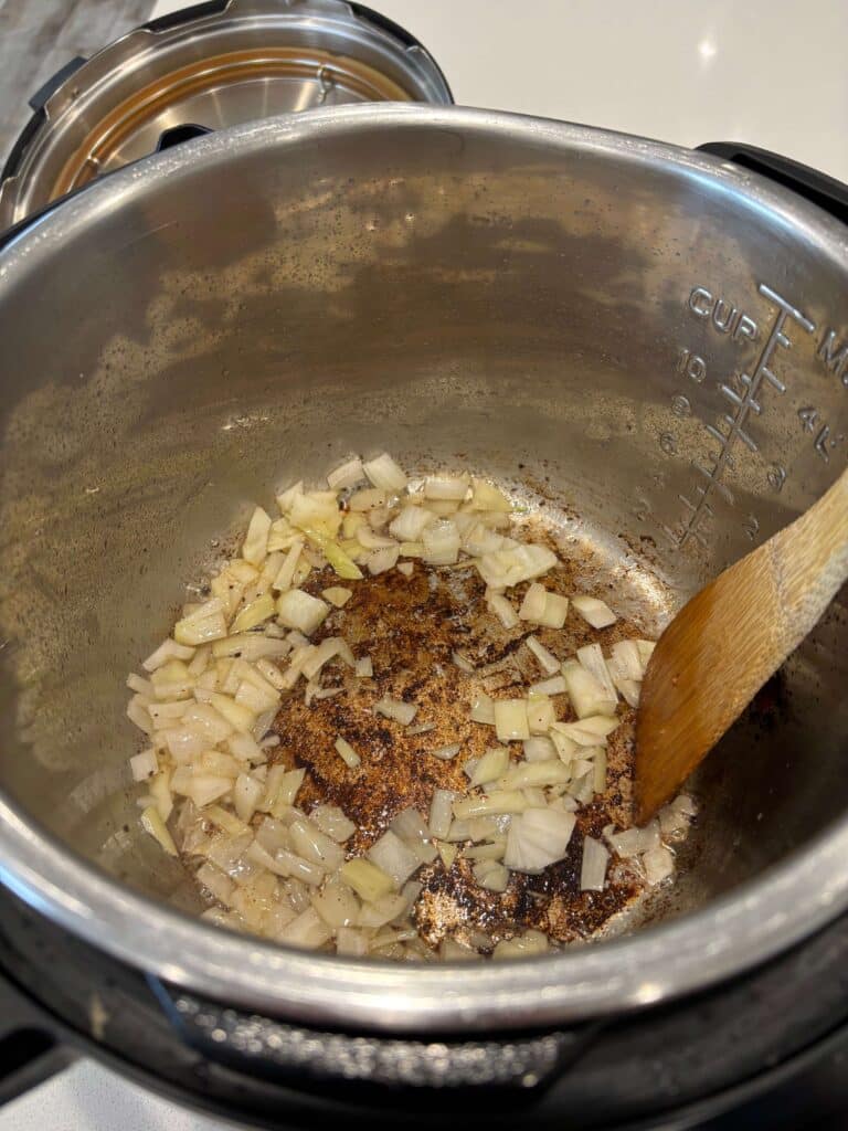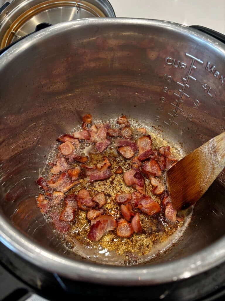 Turn Instant Pot to sauté setting. When display says HOT add in the bacon and cook until crispy. Use a slotted spoon to move the bacon to a paper towel lined plate. Discard all but 1 Tbsp of the bacon grease.