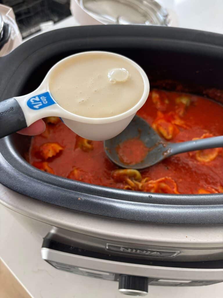 Add in the tortellini and evaporated milk. Cook for 30 more minutes.