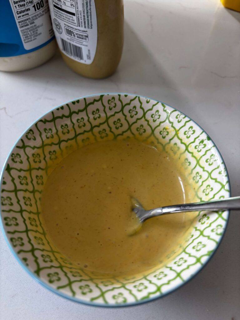 - In a bowl whisk together the mayo, honey, yellow mustard, Dijon and lemon juice.