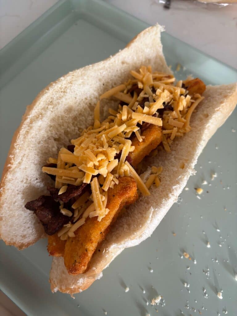 - Assemble each sandwich: Chop 2 chicken fingers and place in one of the buns. Top with one slice of crumbled bacon. Sprinkle 2 Tbsp of cheese on top. Melt the cheese under your oven’s broiler for a couple minutes, watch closely so it doesn’t burn. Top with 1 Tbsp of honey mustard dressing.