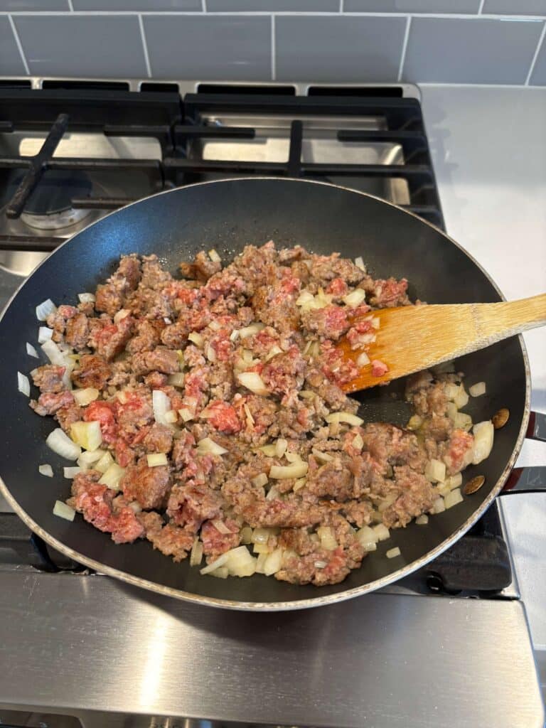 Heat a pan over medium high heat. Add in the sausage and break it up. Add in the onion. Brown for about 5 minutes. Drain off excess grease.