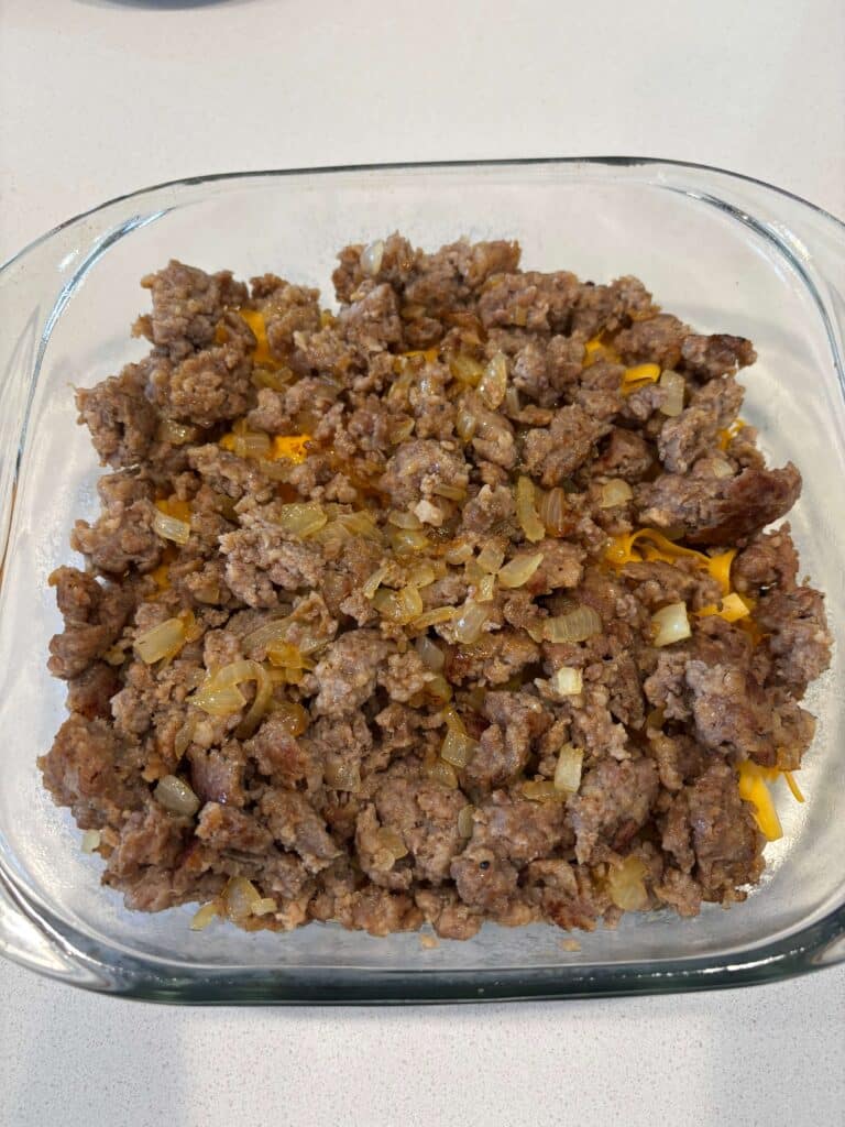 - Spray a 9×9 inch baking dish with non stick cooking spray. Spread the croutons into the bottom of the pan. Cover croutons with pepper jack and cheddar. Sprinkle the cooked sausage over the cheeses.