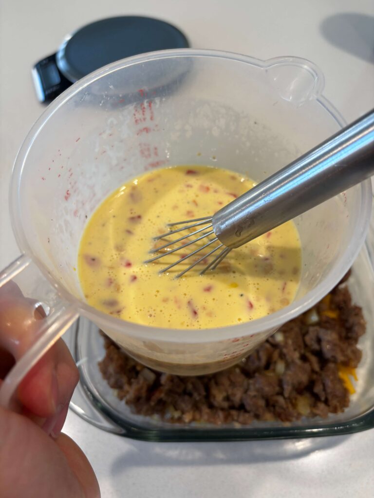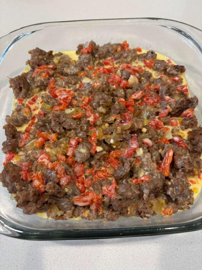 - In a bowl whisk together the eggs, half and half, mustard, salt, pepper and pimientos. Pour the mixture over the sausage.