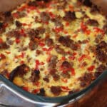 An easy breakfast casserole with eggs, cheese and sausage and a surprise ingredient…croutons!