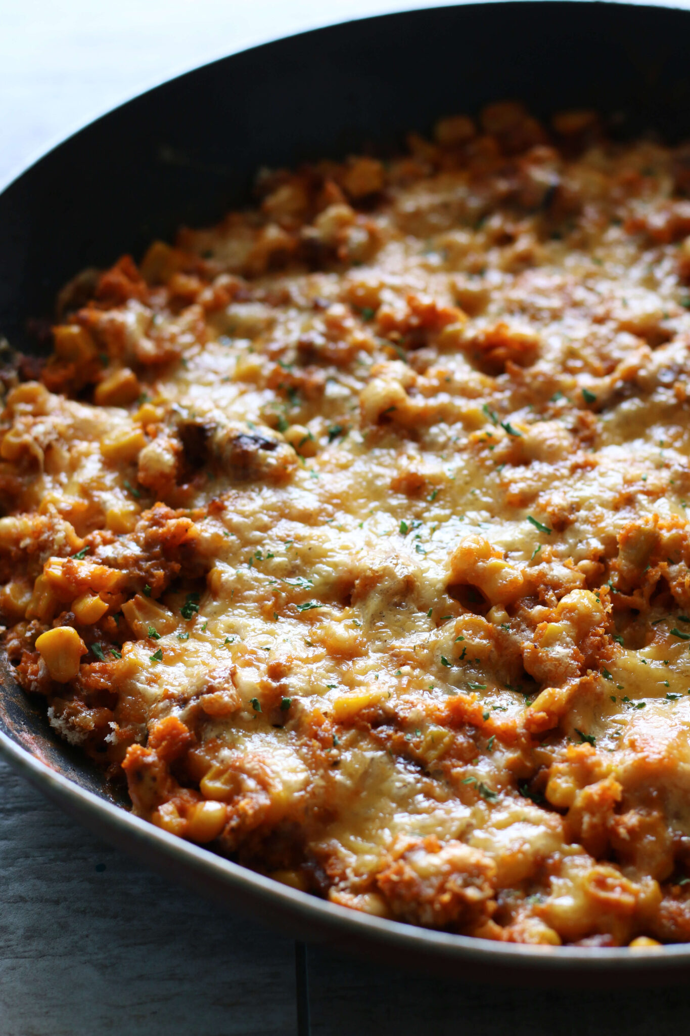 A one-skillet bake made with sausage, eggs, corn, green chiles and a cheddar topping.