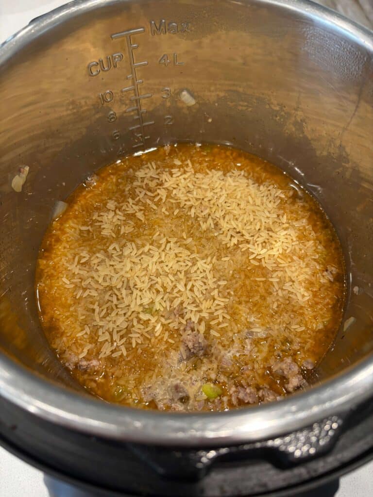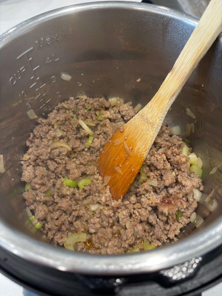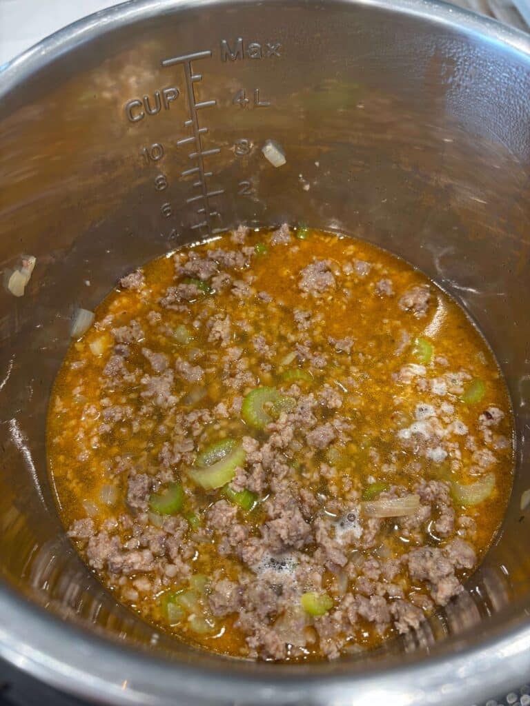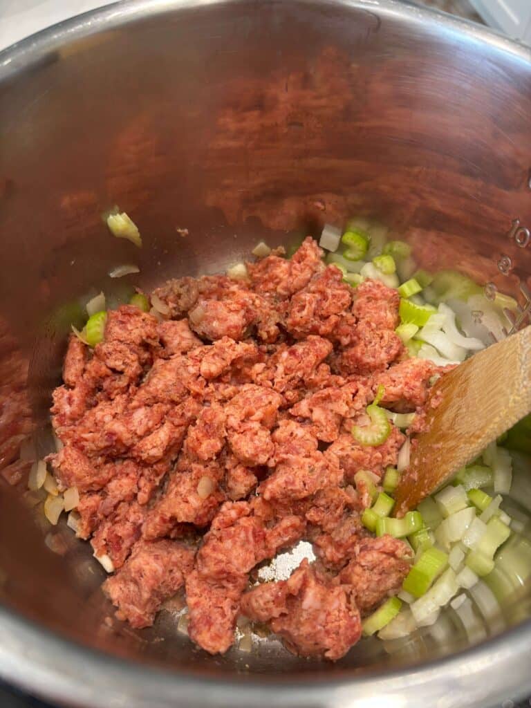 - Turn Instant Pot to sauté setting. When display says HOT add in the sausage and break it up. Add in the onion and celery. Brown for 5 minutes. Drain off excess grease.