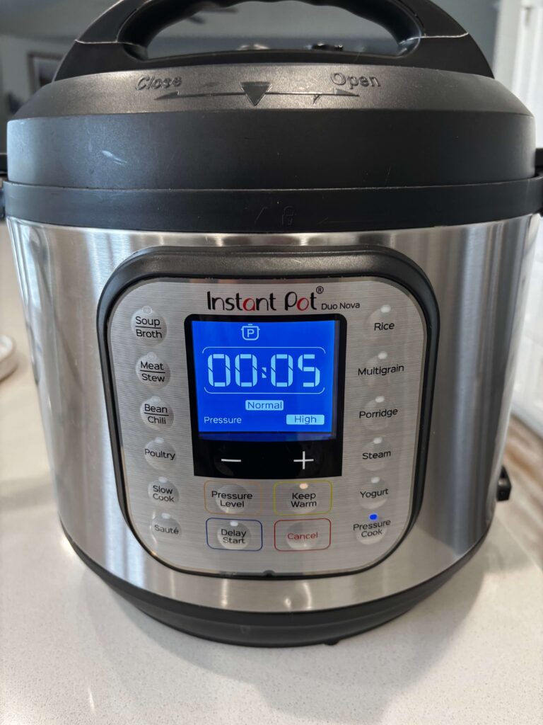 - Cover Instant Pot and secure the lid and make sure valve is set to sealing. Set manual/pressure cook button to 5 minutes. When time is up let pot sit for 10 minutes and then move valve to venting. Remove the lid.