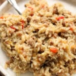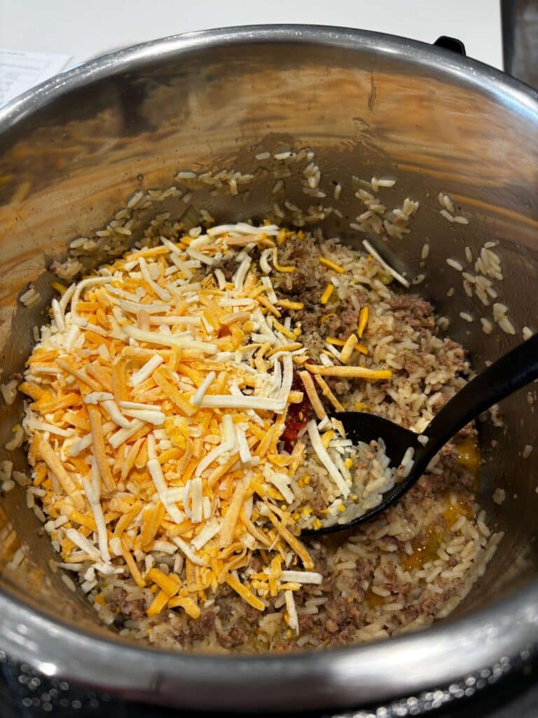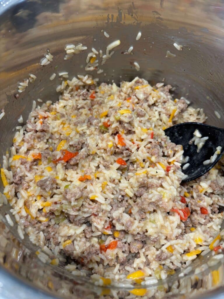 Teton Waters Casserole–a cheesy Instant Pot sausage and rice dish made in one pot with savory sausage, tender rice, pimientos and a splash of cream for the ultimate comfort meal.