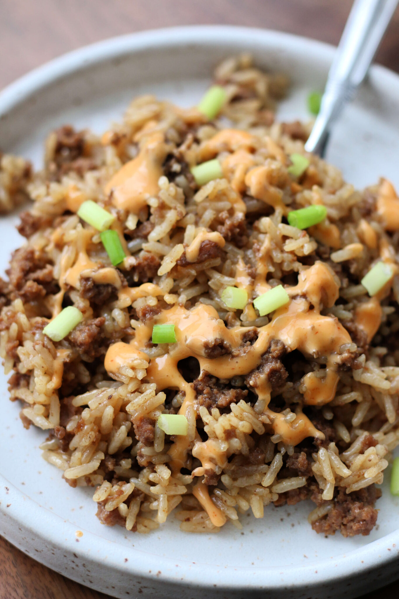Savory, slightly sweet, and just the right amount of spicy, this Instant Pot bang bang beef and rice cooks the meat and rice together in one pot for an easy weeknight dinner.