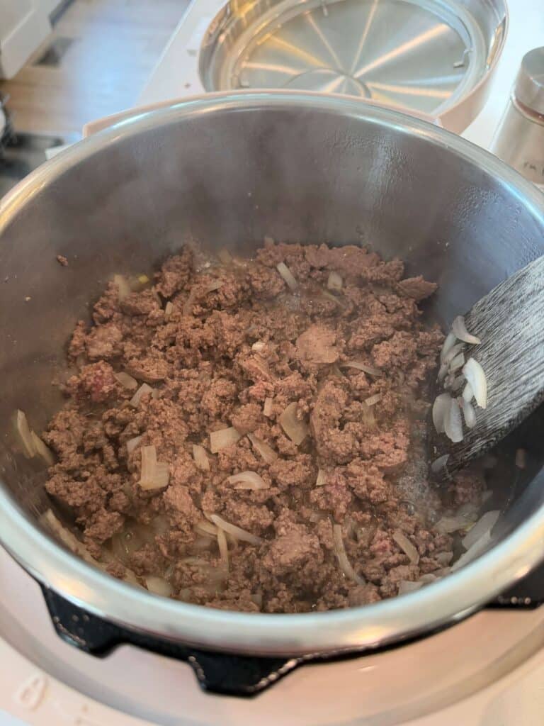 - Turn Instant Pot to sauté setting. When display says HOT add in the beef and break it up. Add in the onions. Brown for 5 minutes. Drain off excess grease. Stir in the salt and pepper.