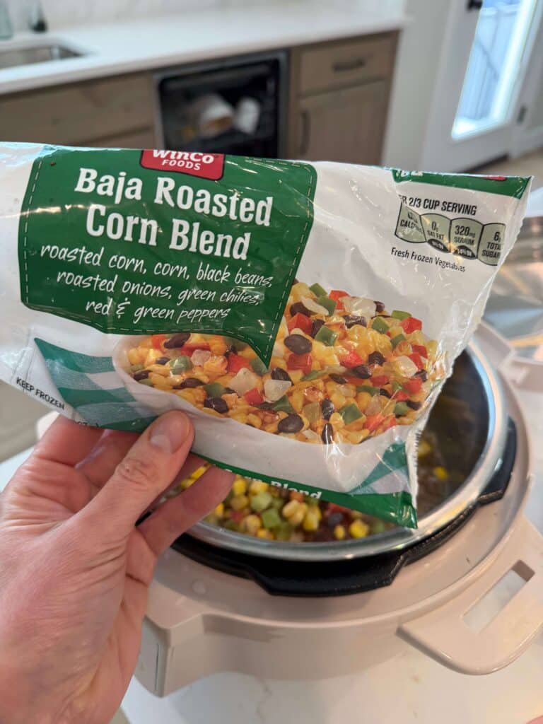 - Frozen Baja roasted corn blend–this is frozen corn with peppers, onions and black beans. Find it in the frozen vegetable aisle.