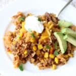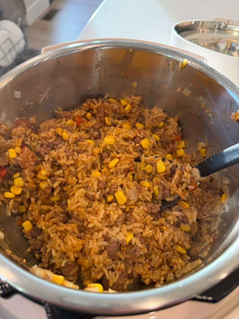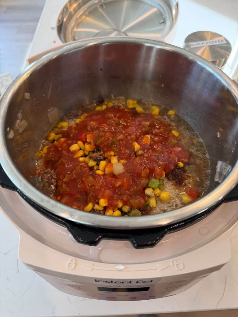 Texas Tornado Casserole–a one-pot Instant Pot beef and rice bowl with seasoned ground beef, fluffy rice, roasted corn and salsa for a quick 30-minute Mexican-inspired dinner the whole family will love.