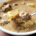 An easy recipe for creamy, cheesy soup with seasoned ground beef, yukon gold potatoes, bacon and cheddar. Make it in the Instant Pot or slow cooker.