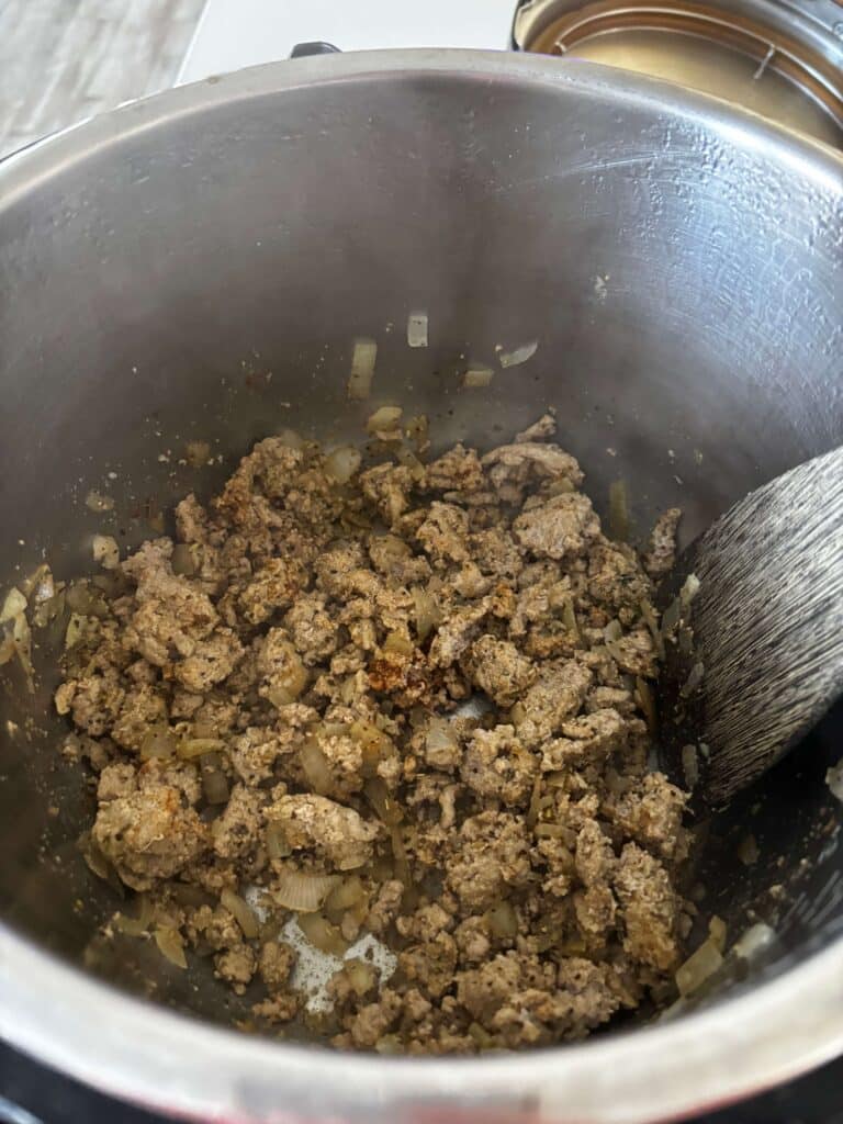 - Turn Instant Pot to sauté setting. When display says HOT add in the oil and swirl around. Add in the onion and turkey. Brown for about 5 minutes. Stir in the salt, garlic powder, paprika, cayenne, sage, rosemary and thyme.