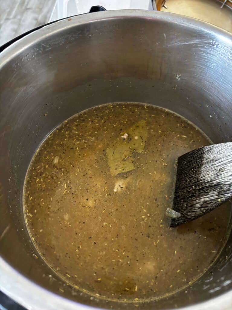Pour in the broth and scrape bottom of pot so that nothing is sticking. Turn off Instant Pot.